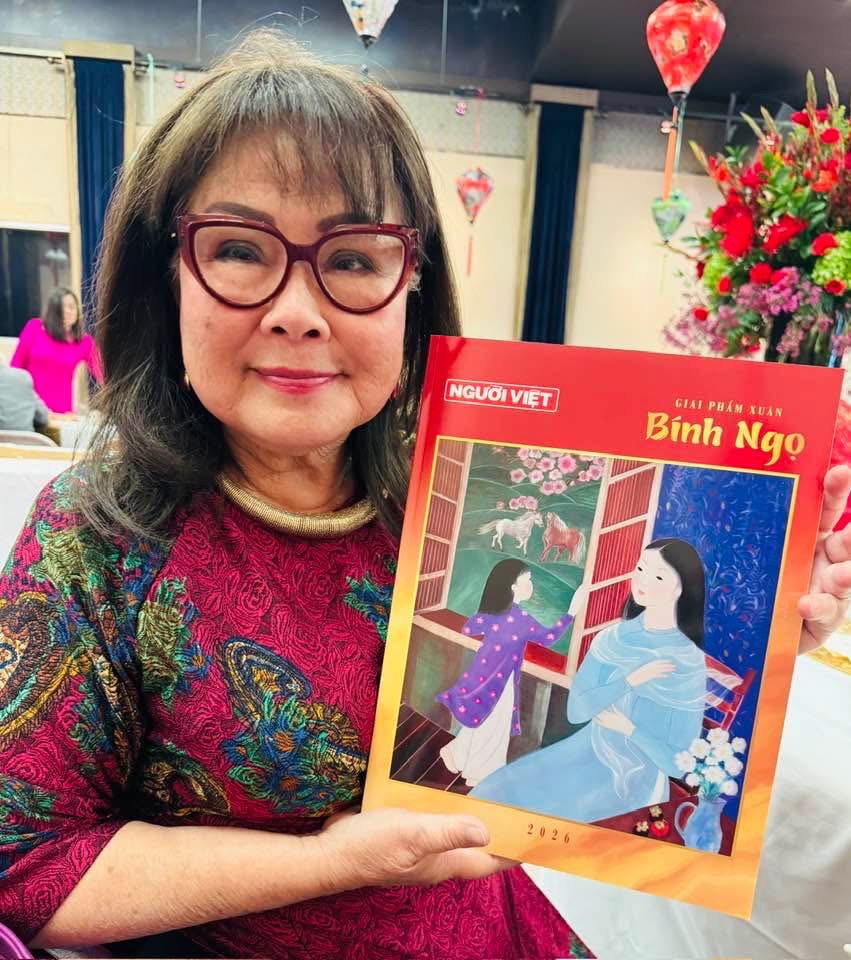 Chị Hồng Tước với tờ báo Xuân Người Việt: Xuân Bính Ngọ.
