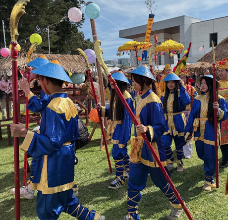 Các em sinh viên trong vai đoàn quân lính của triều đình. Hình phía dưới là hai em sinh viên trong vai Vua và Hoàng Hậu đang đi thăm dân làng.