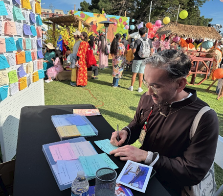 Khách du xuân ngoại quốc trong tấm hình dưới đây đang tham gia với chương trình: Hành trình vượt đại dương tìm tự do của VHM tổ chức. Tôi vội xin phép được chụp một tấm hình của ông ta bởi tôi nhận thấy ông ấy mặc một cái áo dài màu nâu rất đẹp và để rồi “wonder” rằng ông ấy đã viết những gì trên tấm thiếp màu xanh kia?