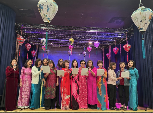 Hợp ca “Ly Rượu Mừng” & Xuân và Tuổi Trẻ do các khách mời trình diễn. (Ảnh Khánh Lan)