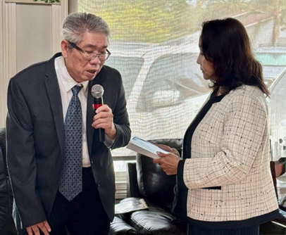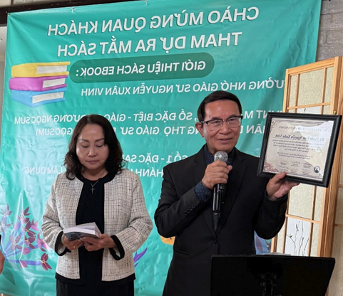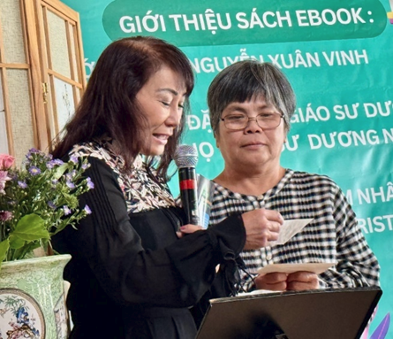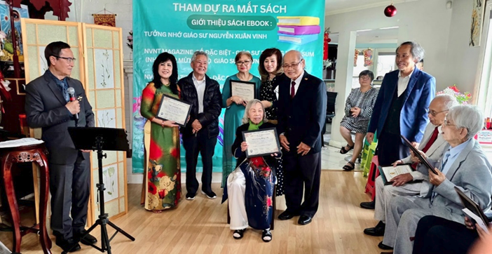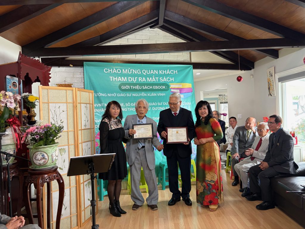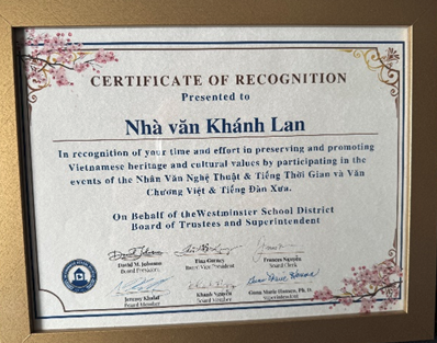 Tiếp đến là GS Quyên Di đại diện cho bà Chủ Tịch Hội Đồng Giáo Dục Học Khu Westminster, Frances Nguyễn Thế Thủy chuyển bằng tưởng lục dến cho Madame Xuân Vinh Phiến Đan qua tay cựu Thiếu Tá Phan Tấn Ngưu trao tặng bà.