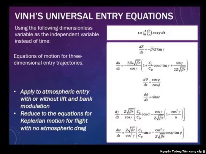 Phương trình của Vinh là gì? Nó được vận dụng trong phương pháp dẫn đường dựa trên quỹ đạo danh định dành cho các phương tiện tái nhập khí quyển siêu thanh. Quỹ đạo danh định được thiết lập thông qua phương pháp giả phổ, sau đó được bám theo bằng phương pháp điều khiển chân trời trượt. Cụ thể, một số chiến lược đã được áp dụng nhằm đơn giản hóa quá trình ứng dụng thực tiễn.