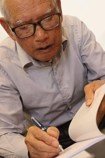 Nhà văn Doãn Quốc Sỹ trong một lần ký tặng sách cho độc giả. (Hình: Uyên Nguyên/Người Việt).