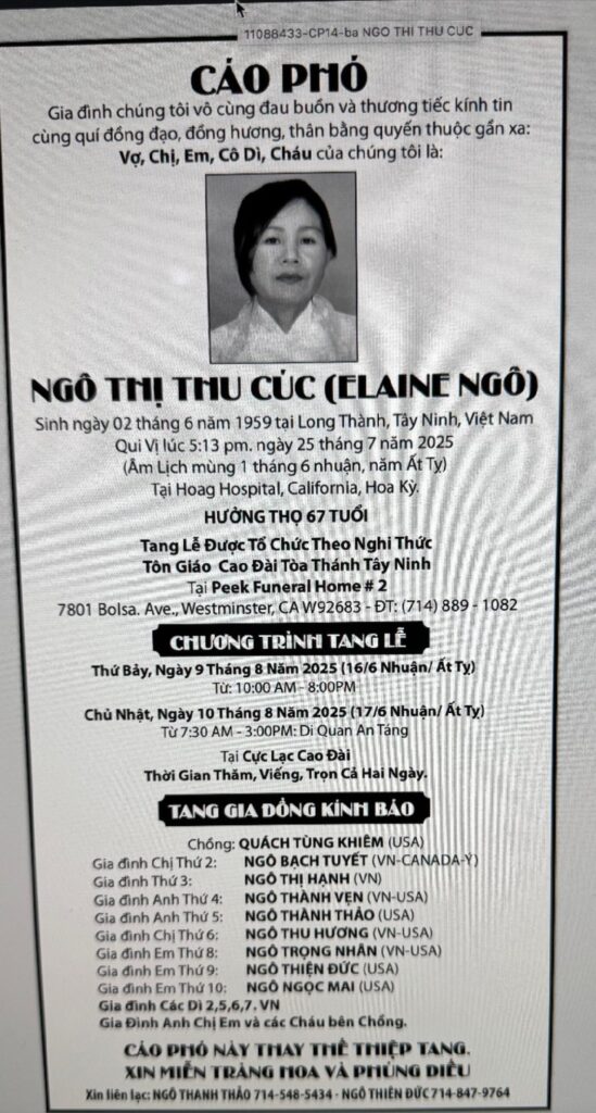 Nhận được cáo phó tin buồn bà Elaine Ngô Thị Thu Cúc, bào tỷ của Trưởng Minh Đức Ngô Thiện Đức, đã qui vị ngày 25 tháng 7 năm 2025. Tại Hoag Hospital, California, Hoa Kỳ