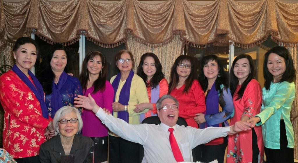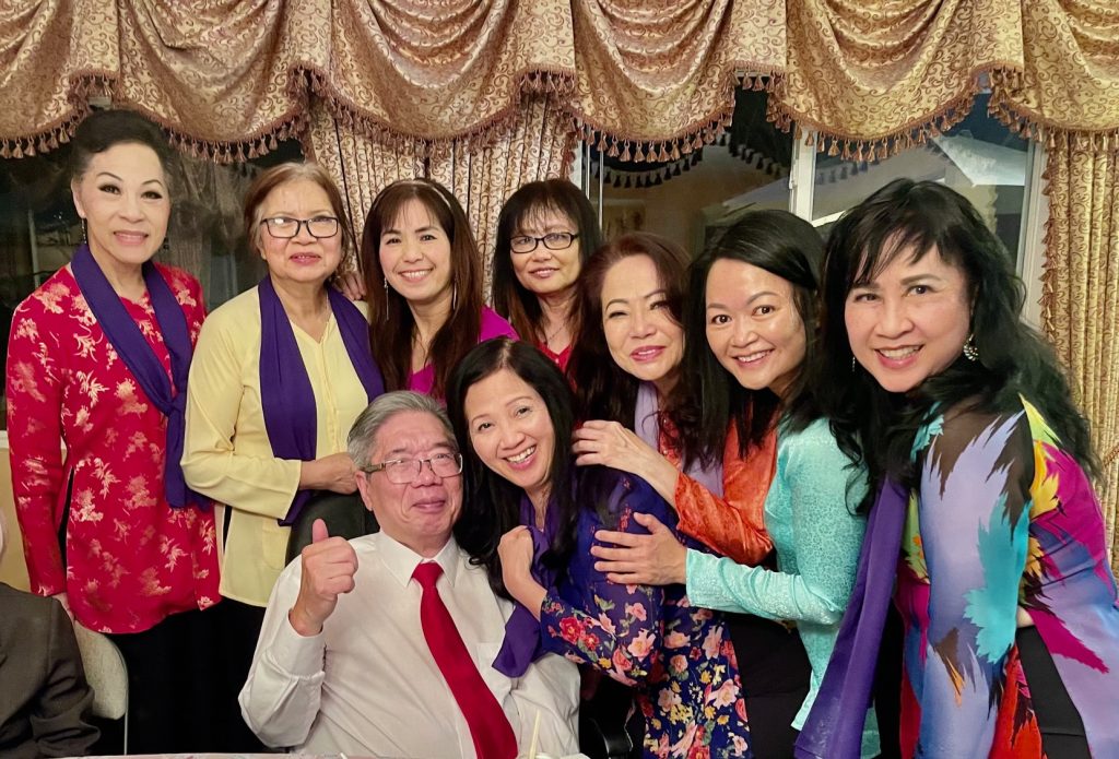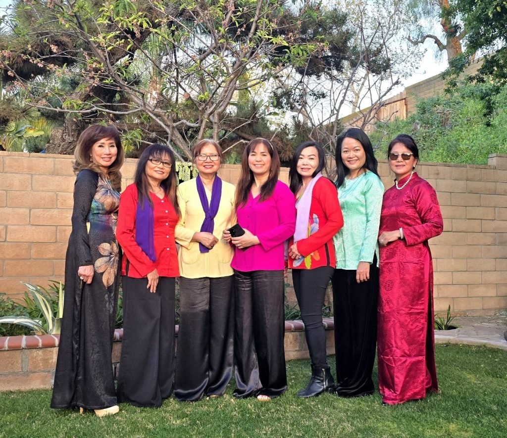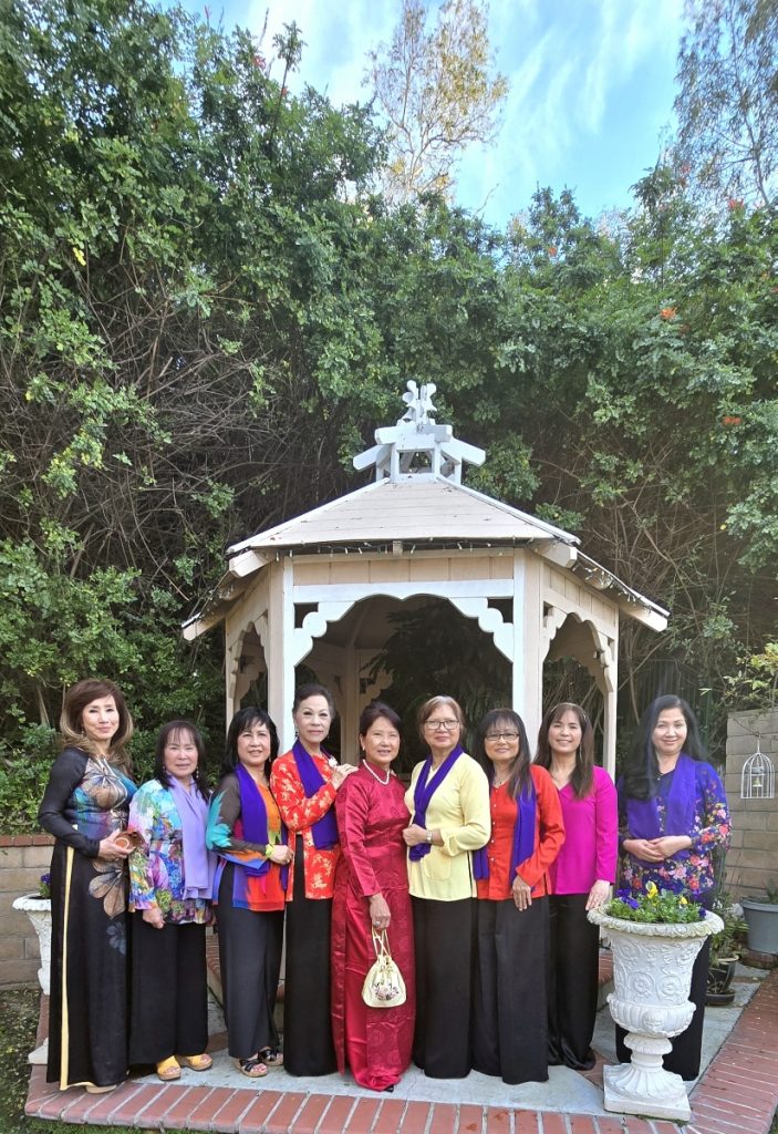 Từ trái sang phải: Minh Khai (Em gái NS Lam Phương), Bích Điệp (Phu nhân NV Ngọc Cướng), Khánh Lan, Ngọc Quỳnh, Kim Hương (Phu nhân Kỹ sư Quốc Dân), Lâm Dung, Jennifer Lâm, Bình Chi, Thụy Lan. (Lệ Hoa & Minh Châu, Chị Mai đến sau vì kẹt xe trên freeway-Rất tiếc sự vắng mặt của anh Alain Đức & chị Ngọc Châu, chị Tường Anh, Mộng Thủy, Chị Kiều My, Ái Liên, Tuyết Nga)