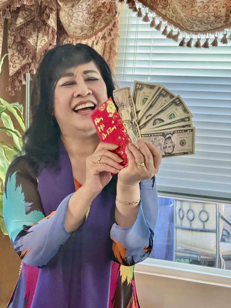 Trong dịp này, thi sĩ Ngọc Hoa của hội Văn bút Việt Nam Hải Ngoại vùng Tây Nam Hoa Kỳ đã “lì xì” cho NVNT & TTG $44 tiền $2 & $5 mới tinh, cũng như ông bà Họa sĩ Hoàng Vinh đã lì xì cho hội của chúng tôi $100. Khánh Lan xin thay mặt cho Liên nhóm NVNT & TTG chân thành gởi lời cảm ơn đến tam vị mạnh thường quân.