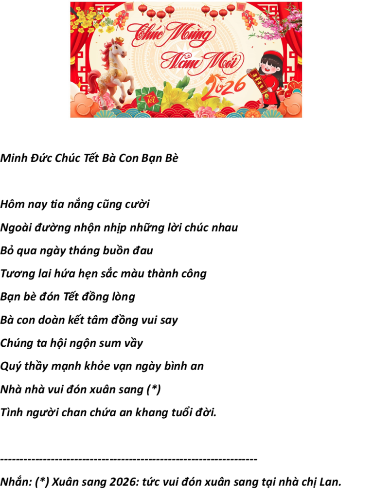 Ngày 01 tháng 3, 2026. NV Việt Hải cũng gởi đến một bài viết Chúc Tết Bính Ngọ 2026 như sau: